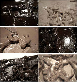 Les plaques sont si fines qu’elles se gondolent et semblent se détacher du mur, et elles sont elles-mêmes le théâtre d’une scène violente, souvent fatale. Les pièces montées jouent sur l’ambivalence attraction-répulsion.